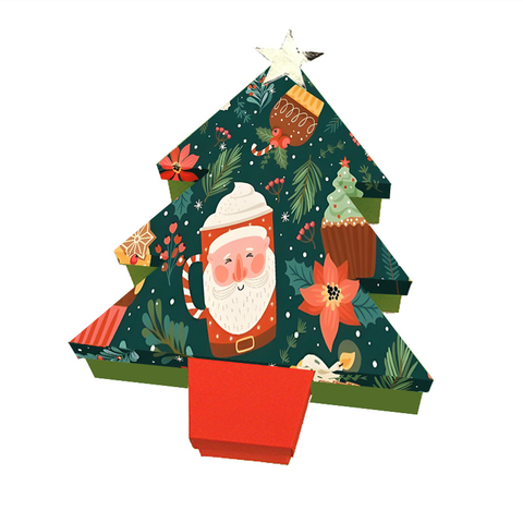 Scatole regalo di cioccolato rigide personalizzate a forma di albero di Natale rosso realizzate in cartone riciclato con goffratura opaca e lucida laminazione